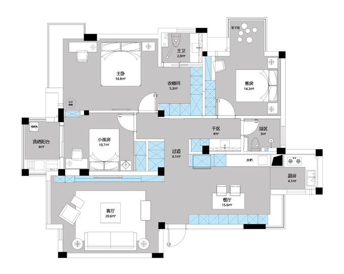 4.縮小南面洗曬陽臺(tái),增加小孩房的面積,取消臥室和客廳的入口,從小孩房進(jìn)洗衣房,這樣臥室的私密感會(huì)好很多,同時(shí)也讓小孩房和洗曬的功能更加合理。