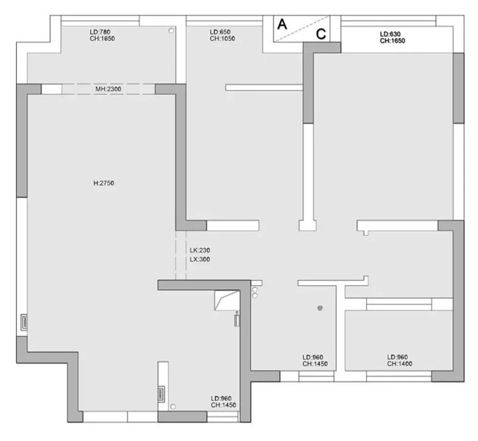 圖1.戶型分析:這是我們測(cè)量時(shí)候的原始結(jié)構(gòu),上面有介紹到是個(gè)比較常規(guī)的三居室的空間,但是在一些小細(xì)節(jié)上也存在很多的不足。1、入戶鞋柜的位置比較尷尬 左手邊深度不夠,右手邊占廚房的空間;2、原結(jié)構(gòu)主臥的衣柜按照原位置會(huì)壓縮主臥整體空間顯得會(huì)比較小;3、衛(wèi)生間空間很小,原結(jié)構(gòu)達(dá)不到業(yè)主想要的干濕分離。