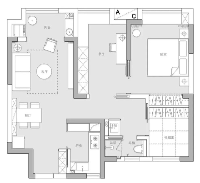 圖2.戶型改造:1、我們將利用鞋柜的柜體和削薄墻體,利用第一扇內(nèi)嵌門,能保證過(guò)道的寬度,鞋柜的正常深度和廚房的空間利用最大化;2、我們利用第二扇內(nèi)嵌門,將衛(wèi)生間改造成干濕分離,原本以為淋浴空間比較小,現(xiàn)場(chǎng)的實(shí)際感受也比較舒適;3、我們利用第三扇內(nèi)嵌門,將北面的小房間打造成榻榻米房,業(yè)主說(shuō)冬天的時(shí)候坐在榻榻米上泡腳就近衛(wèi)生間應(yīng)該是一件很享受的事情;4、我們利用第四扇內(nèi)嵌門,打造了小兩口的書房和臥室的套間;5、我們利用第五扇內(nèi)嵌門,打造了臥室和書房可開(kāi)可合的空間。